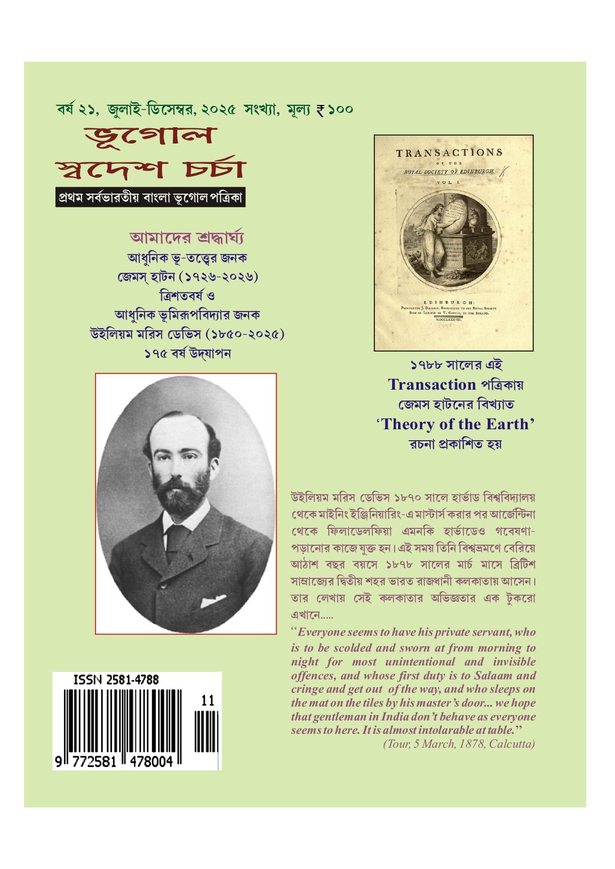 The journal supports national priorities as well as the celebration of global humanity. We are not only committed for the sovereignty and accuracy of the map of our motherland India but also promote awareness among students for the same. Additionally, we observe 22nd February, birthday of 'Father of modern geography in India' Prof S.P. Chatterjee as National Geography Day every year. The journal always encourages socially acknowledged and community-oriented research publications from India and narrative on international issues with value free neutral objectives.