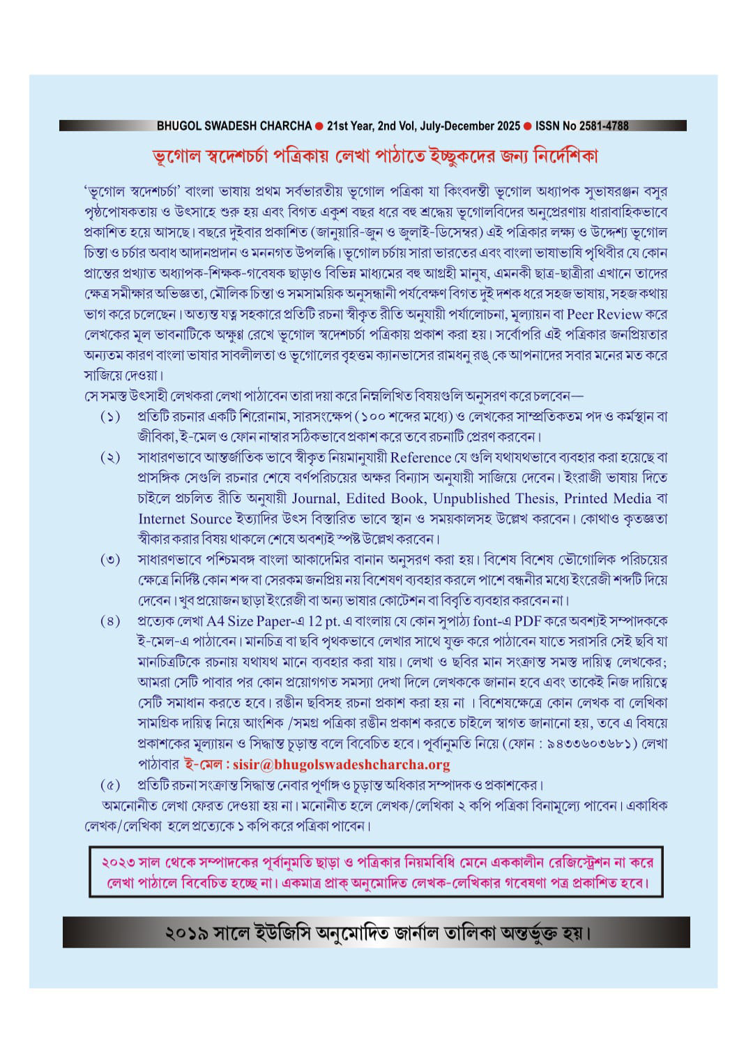 The main reason of the popularity of the Bhugol Swadeshcharcha journal is the presentation of the content in articulate bengali language. Every submission is reviewed and evaluated with care and organized practice, keeping the originality and emotions of the writings and published accordingly. We welcome different views as integral part of our intercultural understanding. Our values and policies are very much inspired by the century old International Geographical Union, most trusted global body of geographers and the outcomes of their Congresses organised every four years.